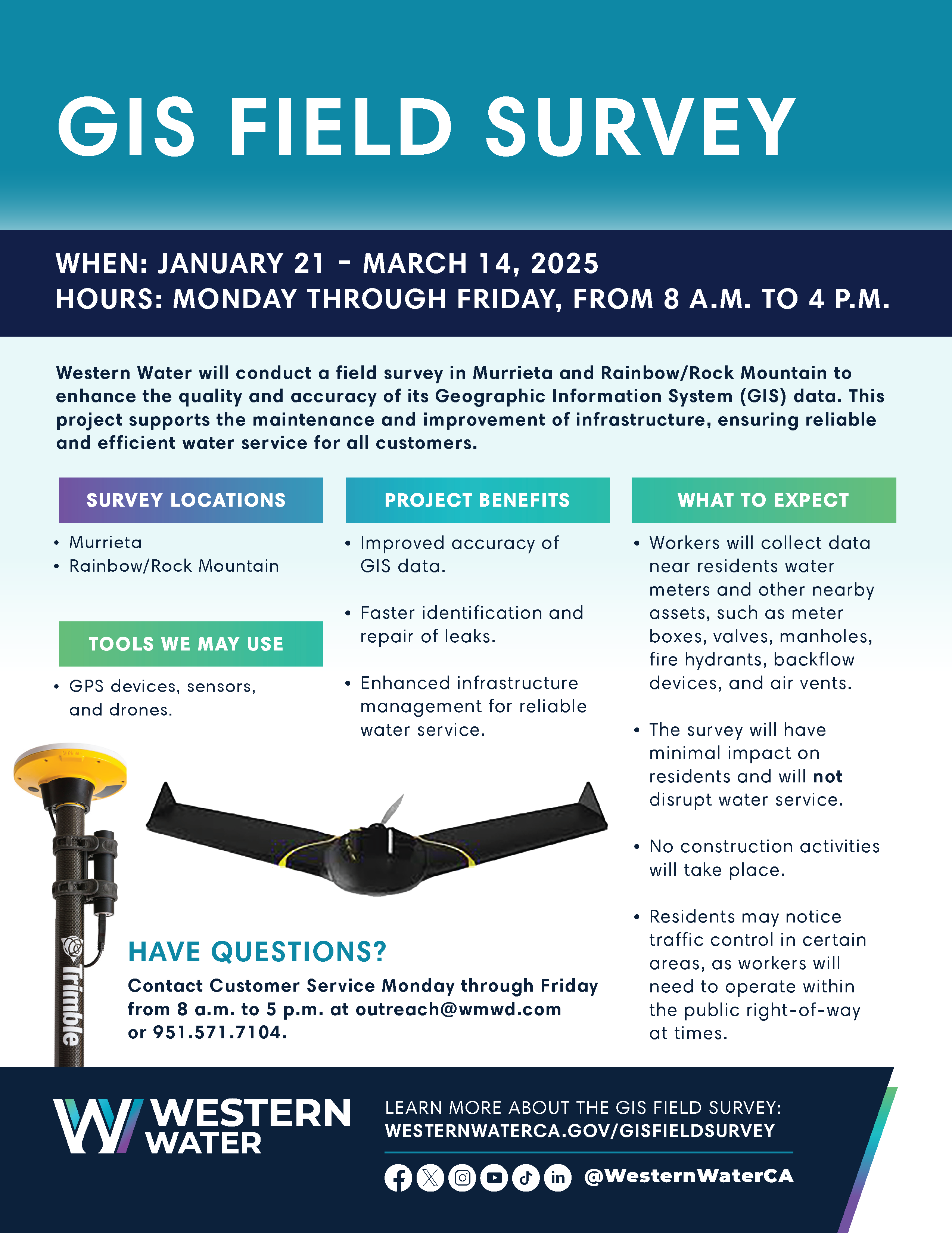 Western Water has contracted NorthSouth GIS to complete this field survey. These contractors are trained to follow all safety and quality standards established by Western Water.